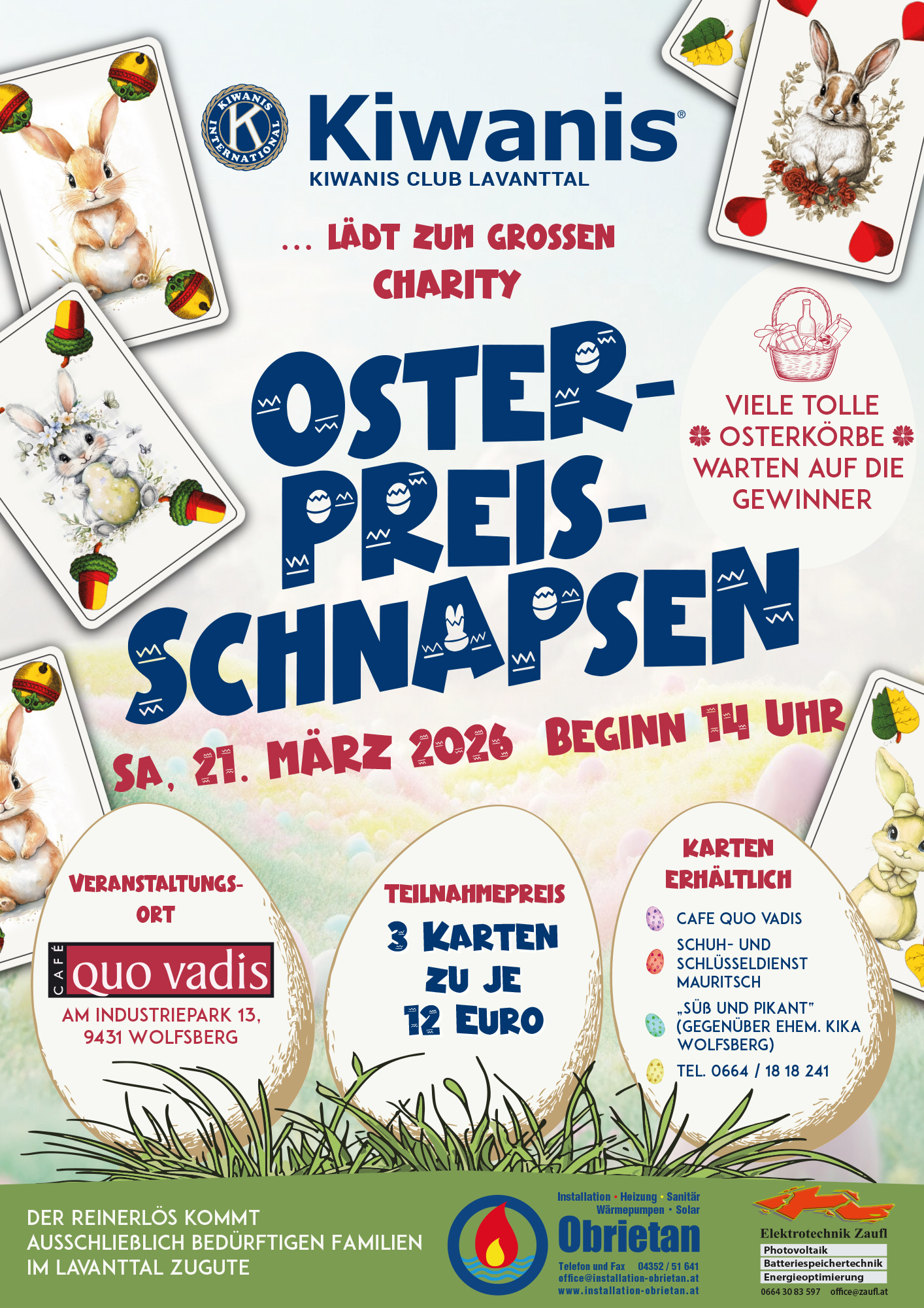 Am 21. März 2026 lädt der Kiwanis Club Lavanttal zum großen Charity Oster-Preisschnapsen ins Cafe Quo vadis, Am Industriepark 13, 9431 Wolfsberg.